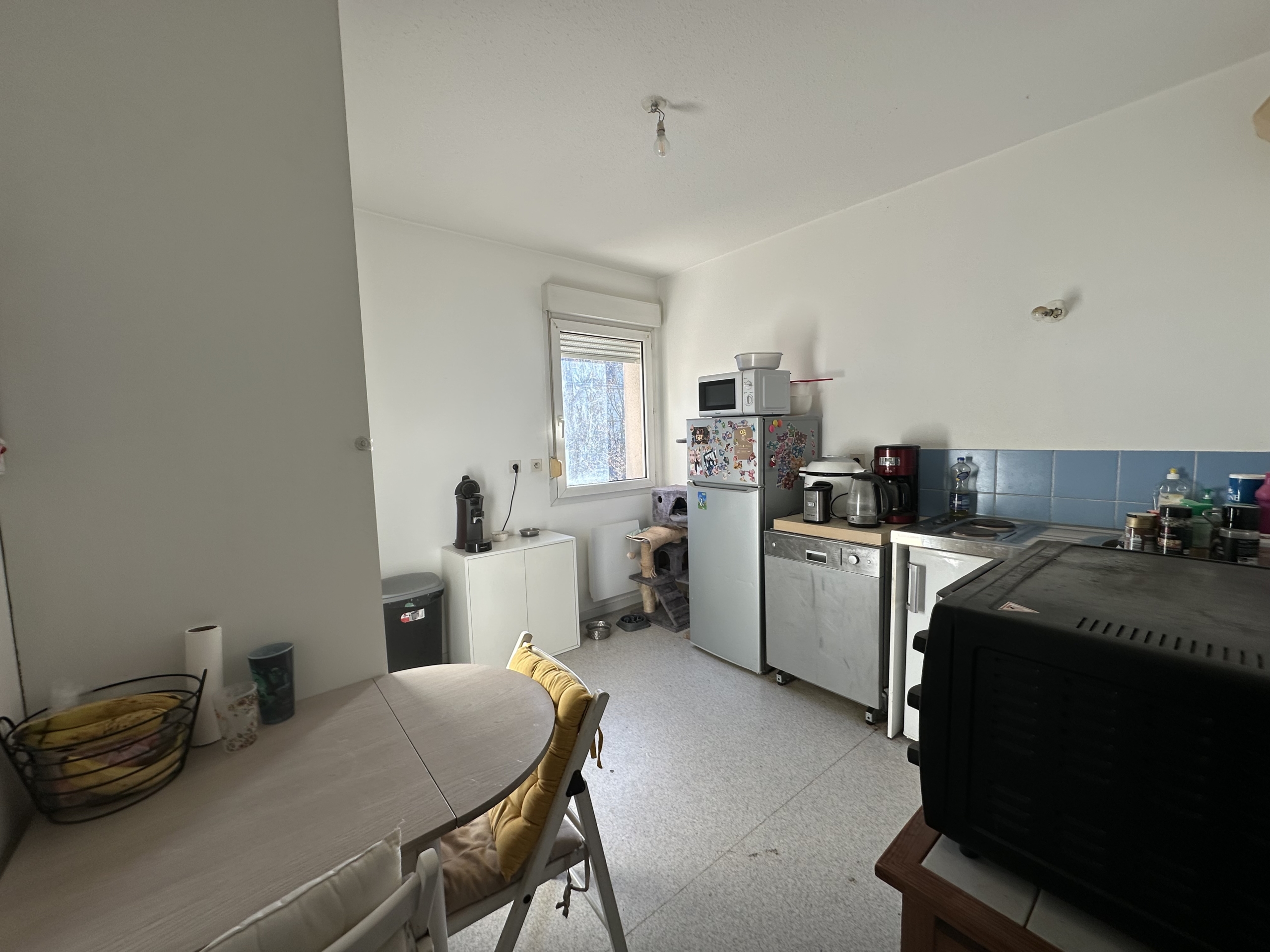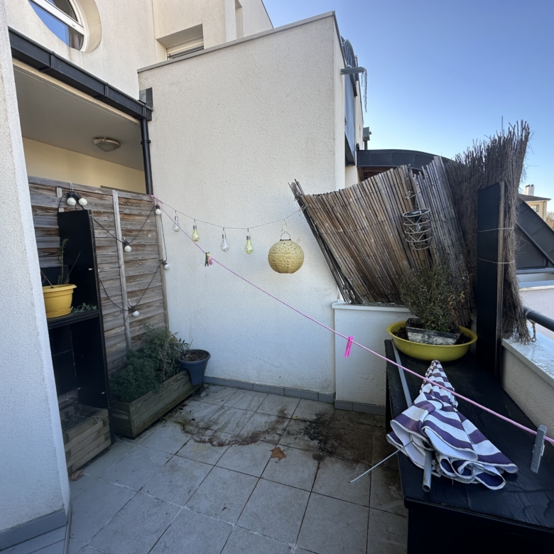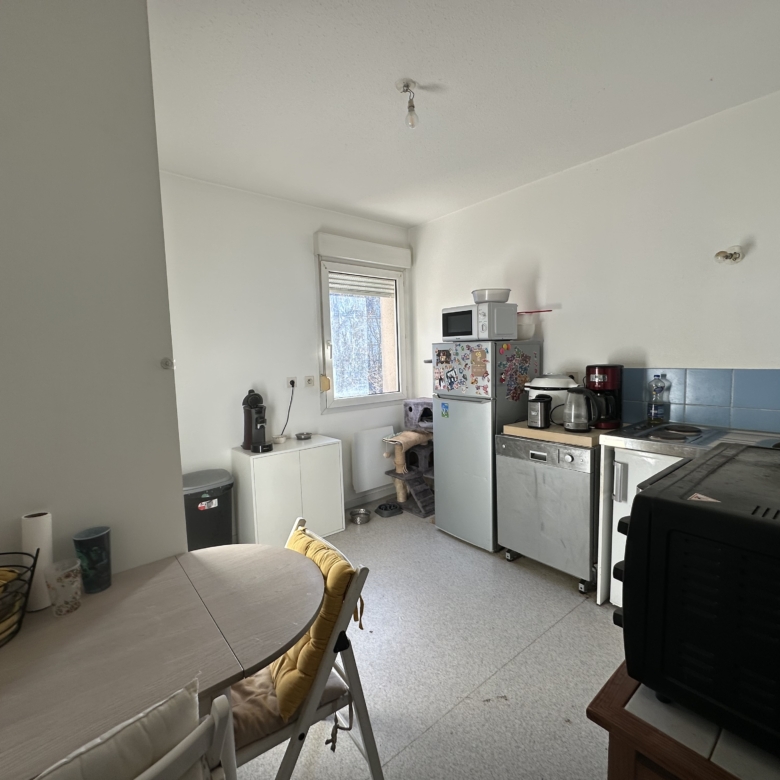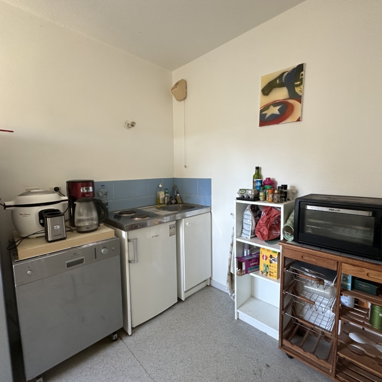 Ce bien possède une entrée avec salon / salle à manger donnant sur un balcon, une cuisine séparée équipée d’un frigo top et de plaques de cuisson. A l’étage se trouve la chambre à coucher ainsi que la salle de bain.